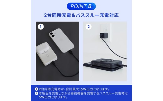 Qi2やMagSafe対応機器では最大15Wでマグネット吸着によるワイヤレス充電ができます。また、Qi2やMagSafe非対応のワイヤレス充電対応機器においても、機器に応じたワイヤレス充電が可能です。
