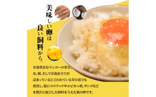 栄養豊富なマンゴーの果実、皮、種、そして栄養素全てが詰まっていると言われている芽の部分も使用し、他にココナッツやエビカニ殻、サンゴなどを贅沢に配合した飼料を与えた鶏の卵です。卵臭さがなく、しっかりとした白身と濃いオレンジ色をしたコクのある濃厚な黄身が特徴です。