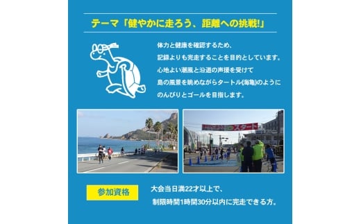 体力と健康を確認するため、記録よりも完走することを目的としています。心地よい潮風と沿道の声援を受けて島の風景を眺めながらタートル(海亀)のようにのんびりとゴールを目指しましょう。