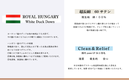 ハンガリー産ホワイトダウンはヨーロッパの寒暖差のある澄んだ空気と滑らかな水の中で育った水鳥は大きくて豊かな弾力性が特徴です。ロイヤルゴールドラベル取得のダウンパワー400dp。しっかりとした保温力とふんわりとした寝心地を実現しました。中身の羽毛は贅沢に93%ボリュームがありながら、2層式立体キルトで寒冷地でもしっかり暖かさをキープします。側生地には、なめらかな肌触りが心地よい綿100%・超長綿60サテンを採用。自然な艶があり、カバーをかけずにそのまま使いたくなるほど、上質感あふれる見た目と肌触りです。【国内powerup加工】日本国内でスチーム高温加熱処理を施した羽毛を使用しています。清潔・安心でより快適にご使用いただけます