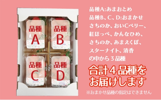 8品種以上のいちごを栽培しているなかから、おすすめ品種「あまおとめ」とおまかせ3品種、合計4品種のいちごをお届けいたします。