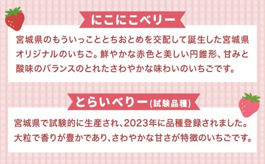宮城県で試験的に生産され、2023年に品種登録されました。大粒で香りが豊かであり、さわやかな甘さが特徴のいちごです。
