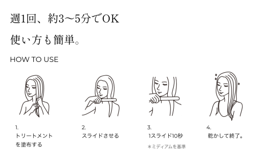 これまでの「手で揉み込む」、「時間をおく」といった手間なく、自宅にいながら、艶、ハリ・コシを実現。