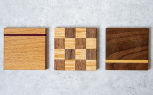 ウォールナット、ヒノキ、ケヤキ、パープルハートの天然木を使用したコースターです。