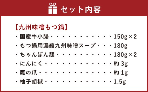 ・もつ鍋用濃縮みそスープ:米みそ〔国内製造〕、しょうゆ、みりん、清酒、砂糖、食塩、おろしにんにく(※原材料の一部に小麦、大豆を含む)