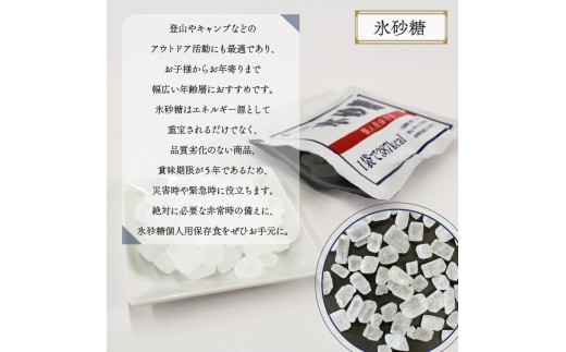 氷砂糖はエネルギー源として重宝されているだけでなく、品質劣化のない商品、賞味期限が5年であるため、災害時や緊急時に役立ちます。
