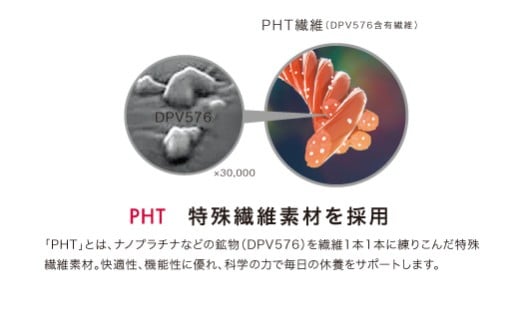 「PHT」とは、ナノプラチナなどの鉱物(DPV576)を繊維1本1本に練りこんだ特殊繊維素材。「PHT」から放出される遠赤外線の効果で血行促進が期待できます。快適性、機能性にすぐれ、科学の力で毎日の休養をサポートします。