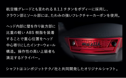 航空機グレードとも言われる8.1,1チタンをボディーに採用し、クラウン部とソール部には、たわみの強いフレクチャーカーボンを使用。ヘッド内部に壁を作り後方部に比重の軽いABS樹脂を装着ことで重心位置をヘッド中心寄りにしたインナーウォール構造。操作性の高い上級者も満足するドライバー。シャフトはコンポジットテクノ社と共同開発したオリジナルシャフト。
