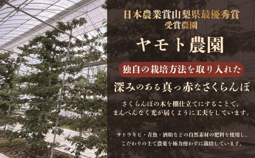 また、独自の栽培方法を取り入れ、サクランボの木を棚仕立てにすることで、木の上から下までまんべんなく光が届くよう工夫をこらしていることから、より一層、深みのある真っ赤な美味しいサクランボとなります。