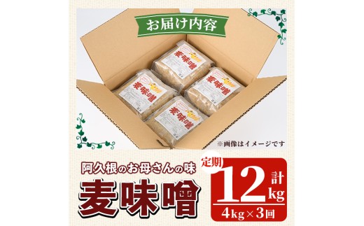 <定期便・全3回> お母さんのおいしい麦味噌 (計12kg・4kg×3回) みそ 調味料 味噌 みそ汁 手作り 味噌汁 お味噌汁 朝ごはん ミソ 小分け 母の味 定期便 【阿久根市生活研究グループ】akn072-05