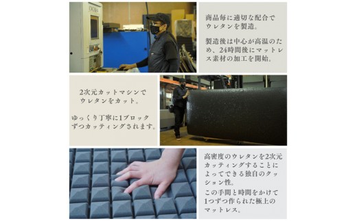 このマットレスは、福岡市本社の寝具メーカー「Yurikago」が企画し、家具のまちとして知られる福岡県大川市の専門工場で、職人が1つひとつ丁寧に仕立てた受注生産品。できたてを工場から直接お届けします。