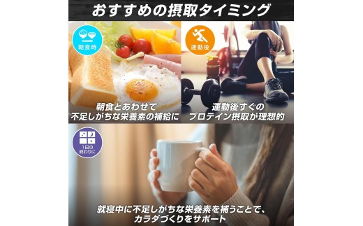 おすすめの摂取タイミング(目安):朝食時、運動後、1日の終わりや小腹が空いた時などを目安にお召し上がりください。