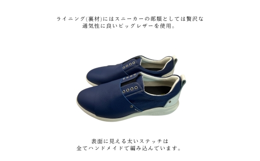 外羽根のプレーントゥのデザインを覆う1枚のシュリンクレザーが特徴。また、シューレースの代わりに甲ゴムを使用することで脱ぎ履きのし易さがUP。全面にソフトシュリンクレザーを採用し、ライニングにはスニーカーの部類としては贅沢なピッグレザー(通気性に良い)を全体に使用しています。表面に見える太いステッチは全てハンドメイドで編み込んでいます。ソールのグリップ性能は、スタッドレスタイヤの形状を利用している為、雨の日には滑りにくくなっています*1。また、カップインソールにおいては、従来のEVAスポンジからウレタンスポンジを使用することによりクッション性能の持続力がUPされ着地時の衝撃を吸収します。 1歩行状況によっては、まったく滑らないということではありません。個人差がございますので歩行には十分にご注意下さい。
