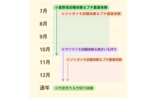 ・体験日程とご予定が合わない場合は、「タケノコ収穫体験&竹切り体験」「ジャガイモ収穫体験&プチ農業体験」「夏野菜収穫体験&プチ農業体験」「サツマイモ収穫体験&焼きいも作り」「春野菜収穫体験&プチ農業体験」から変更可能です。変更される場合はHP記載の連絡先からお問い合わせください。(変更は1回のみ可)