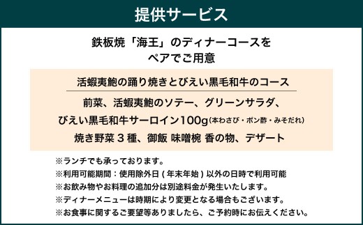 鉄板焼「海王」のディナーコースをペアでご用意。