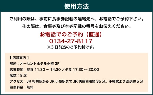 ・ご利用の際は、事前に食事券記載の連絡先へ、お電話でご予約下さい。その際は、食事券及び本券記載の番号をお伝えください。