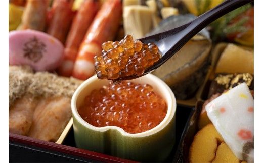 筍土佐煮 蒸し鮑、穴子八幡巻き 網笠柚子、栗金団 黒豆、車海老姿煮 末広麩、伊達巻玉子 羽子板蒲鉾、梅花人参 鰊昆布巻き、紅白花餅、合鴨ロース 豆慈姑、銀鱈西京焼 糸うに、数の子 田作り、サーモン味噌幽庵焼 翁昆布、鱒の子 酢取り長芋