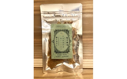 陸前高田市のブランド米、”たかたのゆめ”を使用して玄米麴及び黒麴を製造し、その麹と地元広田湾の青のりのみで味付けしたチキンジャーキーです。