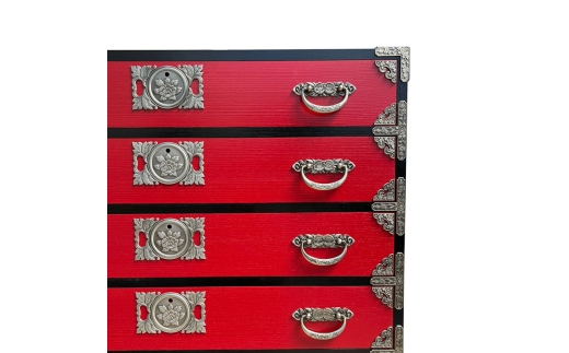 総桐に赤と黒のカシュー漆仕上げを施し、装飾に時代金物をつけていますので、重厚感のある趣をかもしだしています。