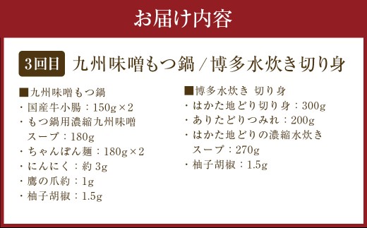 【3ヶ月定期便】博多の名物「国産牛 上ホルモン もつ鍋」&「博多水炊き」&「博多和牛スライス」3回コース すき焼き しゃぶしゃぶ 水炊き ザブトン 肩ロース ホルモン 和牛 冷凍 お取り寄せ グルメ ご当地 人気 九州 福岡 博多 名物 遠賀町 定期便