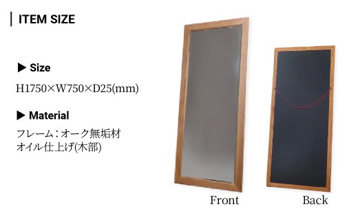 床置き型の大型ミラー。高さ175cm、幅75cmのサイズとなり全身を確認するのに重宝する姿見です。フレームはオークの無垢材を使用し経年変化も楽しめる材料となります。