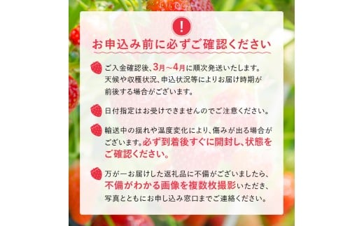 ピーク時(12月~2月)の収穫に比べ酸味が強くなるため、少し糖度を感じにくい場合がありますが、爽やかないちごの風味をお楽しみいただけます。