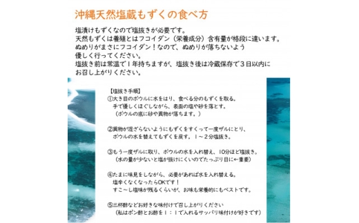 市場に出回る多くは養殖もずくですが、こちらは熟練の潜水漁師が、一本一本を丁寧に手摘みする 希少な天然もの。