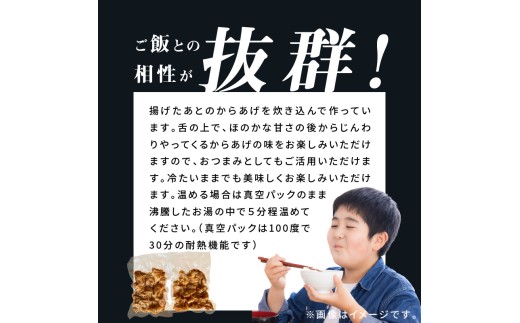 揚げたあとのからあげを炊き込んで作っています。ご飯との相性が抜群です。舌の上で、ほのかな甘さの後からじんわりやってくるからあげの味をお楽しみいただけますので、おつまみとしてもご活用いただけます。冷たいままでも美味しくお楽しみいただけます。温める場合は真空パックのまま沸騰したお湯の中で5分程温めてください。(真空パックは100度で30分の耐熱機能です)