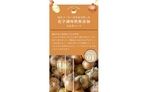 糖度の高い淡路島産の玉ねぎをふんだんに使用し、素材そのものの甘みとコクを活かしたスープです。味付けは化学調味料を一切使用せずに仕上げています。健康志向の方や、ご家族みなさまで安心してお召し上がりいただけるやさしい味わいです。