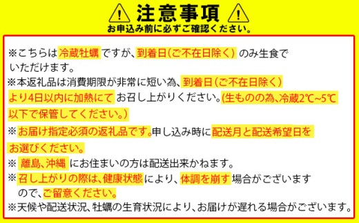 ・こちらは冷蔵牡蠣ですが、到着日(ご不在日除く)のみ生食でいただけます。