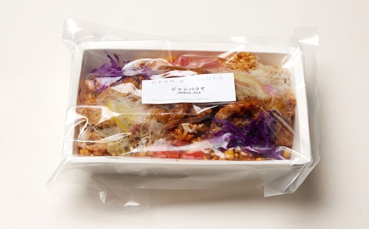 ジャンバラヤライス(精白米[国産]、野菜[たまねぎ〈国産〉、赤パプリカ、黄パプリカ]、スイートコーン、グリーンピース、香辛料、バター、食塩、カレー粉、チキンコンソメ)、ジャンバラヤチキン(鶏唐揚げ[鶏肉〈ブラジル産〉、清酒、食塩、香辛料、衣、揚げ油〈なたね油、大豆油〉]、半固体状ドレッシング、しょうゆ)、野菜(キャベツ、トマト)、半固体状ドレッシング、レモン、香辛料、食塩/加工デンプン、増粘剤(加工デンプン、増粘多糖類)、調味料(アミノ酸等)、香辛料抽出物、カラメル色素、酸味料、(一部に小麦・卵・乳成分・大豆・鶏肉・豚肉・りんごを含む)