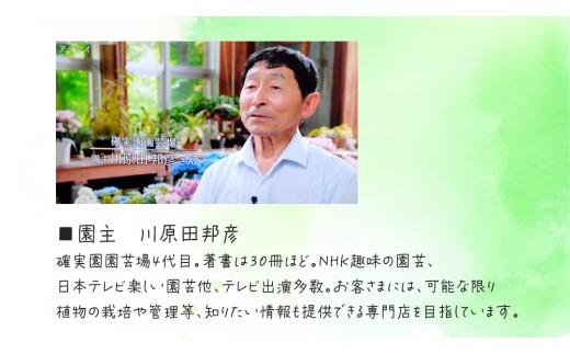 「確実なもの、お客様のところで枯れないものを販売する」というコンセプトのもと「確実園」という店名が決められ、その伝統を受け継いでいます。