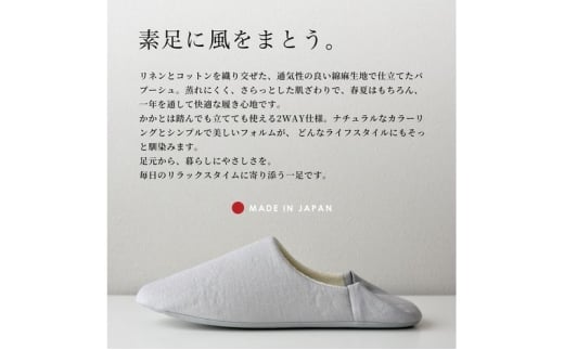リネンとコットンを織り交ぜた通気性の良い綿麻生地で仕立てたバブーシュは、蒸れにくく、さらっとした肌ざわり。春夏はもちろん、一年を通して快適な履き心地です。