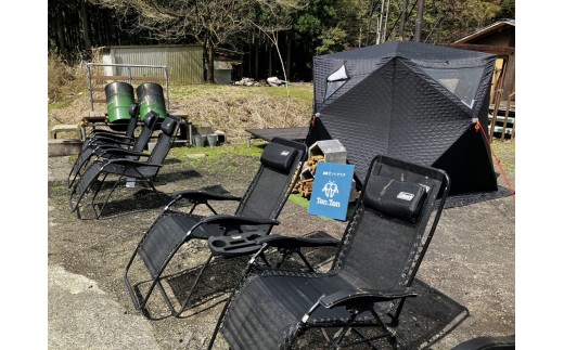 提供・貸出品:ストーブ付きテントサウナMORZH1台、サウナ用ベンチ、インフィニティーチェア4脚、ロウリュグッズ、ロウリュ用アロマオイル、薪、オロポ(オロナミンC10本、ポカリ2L)
