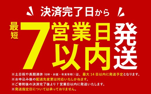 ※土日祝や長期連休(GW・お盆・年末年始)は、最大14日以内に発送予定となります。