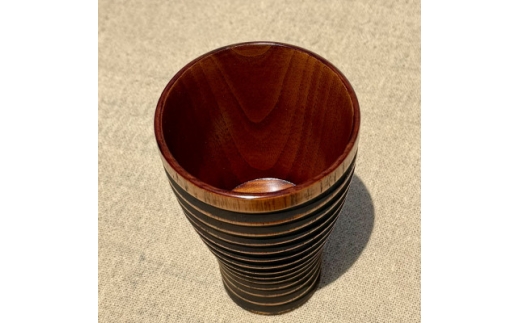 ビールを飲むのに適した型のカップをスリ漆で仕上げ、その後にマコモの粉を三度に亘り掛け、くすんだ趣のあるデザインに仕上げました。男性好みの逸品と言えるでしょう。