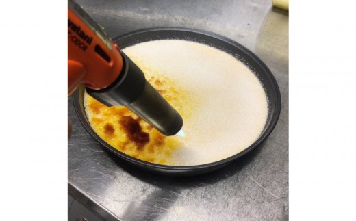 砂糖、バニラで濃厚プリンを焼き、冷凍後グラニュー糖まぶしバーナーでキャラメリゼする、濃厚でなめらかな冷凍プリン