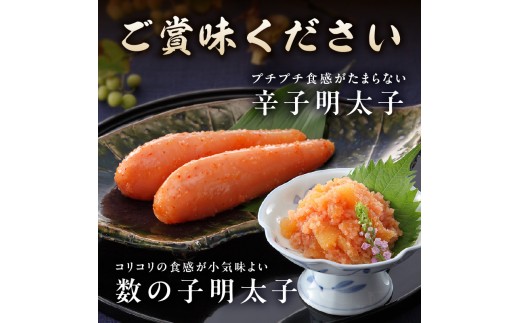 「匠のたれ」で168時間熟成した、まろやかで奥深い味わいの辛子明太子と、人気の数の子明太子を詰め合わせました。