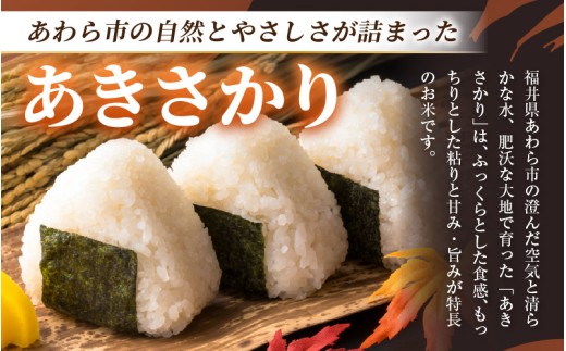 福井県あわら市の澄んだ空気と清らかな水、肥沃な大地で育った「あきさかり」は、ふっくらとした食感、もっちりとした粘りと甘み・旨みが特長のお米です。品種は「コシヒカリ」と「キヌヒカリ」の良さを受け継いでおり、冷めても美味しく、お弁当やおにぎりにも最適です。地元を代表するブランド米として親しまれています。