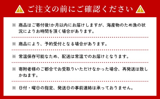 ・商品は海産物が主であり、季節や天候により漁が出来ない事もあるため、在庫薄の際はお届けにお時間を頂く事があります。