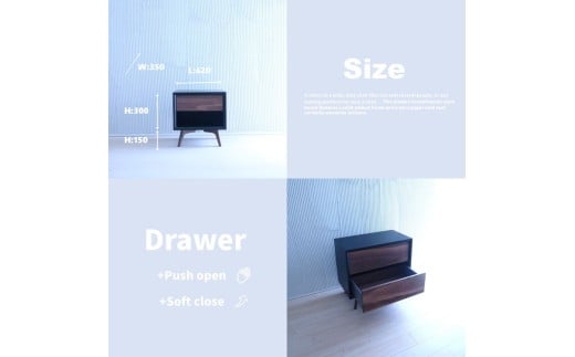 引出しは取手をなくすことで木目を際立たせるプッシュオープン機能と、静かで安全に閉まるソフトクローズ機能を搭載。指挟みや衝撃音を防ぎ、快適な使用感を実現します。さらに、ボックスの大きさや脚の高さはお好みに合わせて選択可能。