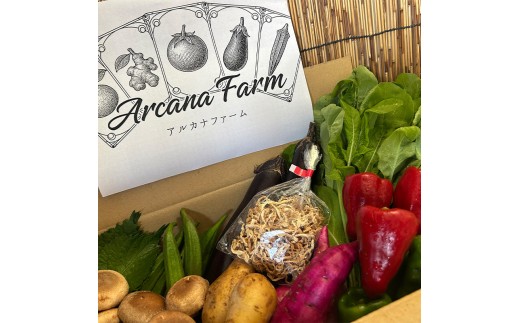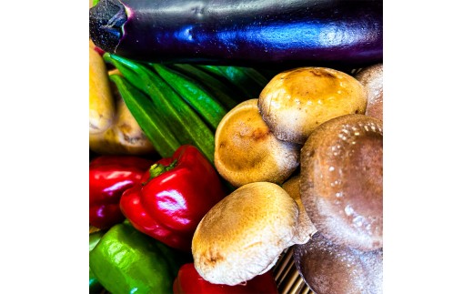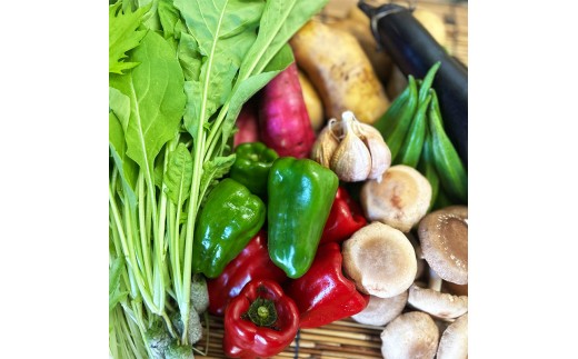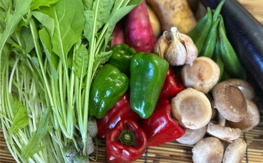 新生姜、空芯菜、サニーレタス、水菜、小松菜、モロヘイヤ、バジル、おくら、なす、きゅうり、トマト、ミニトマト、ししとう、甘長とうがらし、枝豆、里芋、赤紫蘇