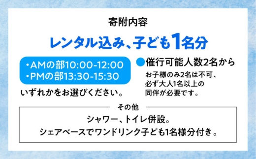 特徴:AMの部10:00-12:00 PMの部13:30-15:30 のいずれかをお選びください。レンタル込み。催行可能人数2名から。シャワー。トイレ併設。シェアベースでワンドリンク子ども1名様分付き。