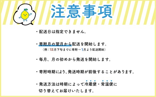 ・配送日は指定できません。 ・寄附月の翌月から配送を開始します。(例:12月下旬までに寄附→1月より配送開始) ・毎月、月の初めから発送を開始します。 ・寄附時期により、発送時期が前後することがあります。 ・発送方法は時期によって冷蔵便・常温便に切り替えてお届けいたします。 |