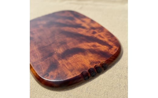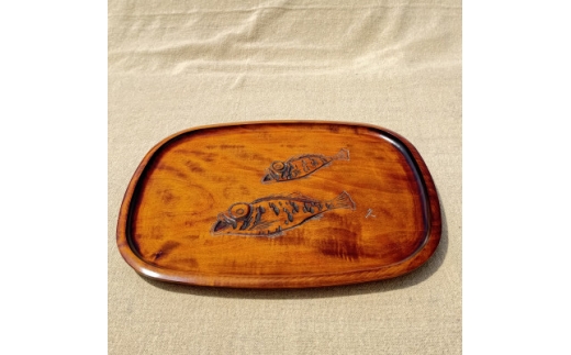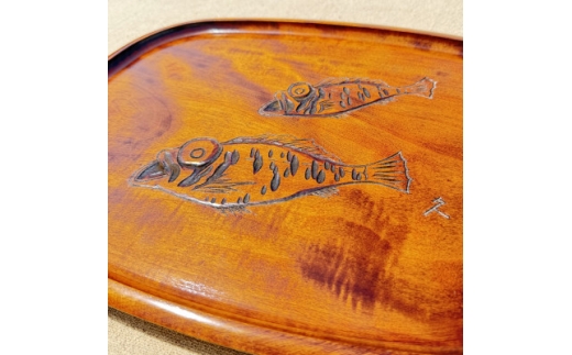 やさしい撫角の型のお盆に、めばるを彫り、スリ漆で仕上げました。讃岐彫の図柄としては珍しく、グッドデザインです。裏にもノミをたたいて持ちやすくしており、運び盆として使い勝手がいい品です。お膳としても使っていただけます。