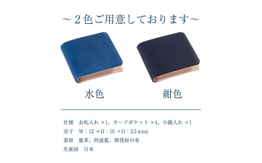 - 財布 藍染 国産 鹿革 水色 手作り 二つ折り財布 ウォレット カード ポケット 藍染め 阿波藍 革製品 間伐材の布 カードケース 軽量 おしゃれ ファッション 小物 アクセサリー ビジネス ギフト プレゼント 祖谷 ジビエ みよし 徳島県 三好市 DIYA