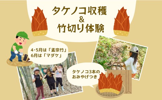 タケノコ3本のおみやげつきです。1組5名様までお申込みできます。体験時期は4月~6月です。