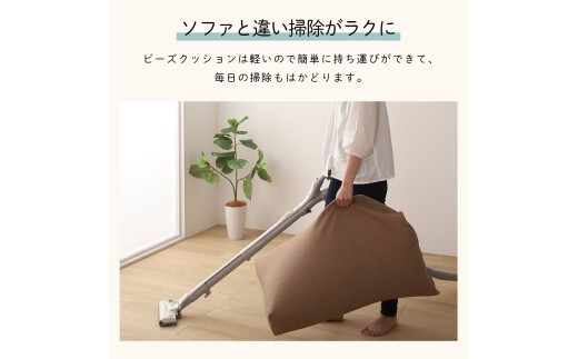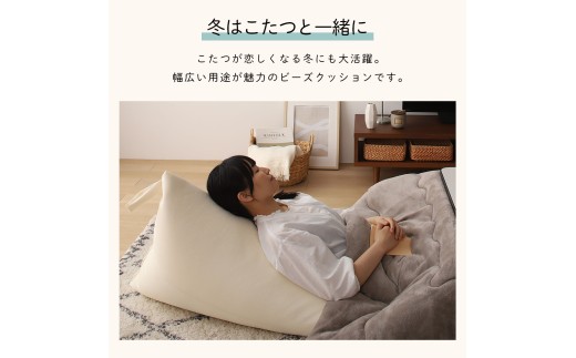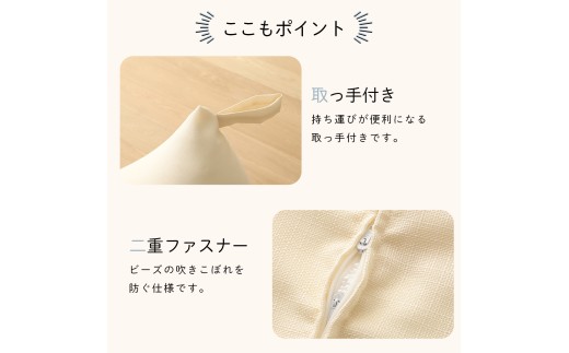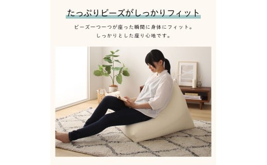 背もたれにもなる三角型のビーズクッション。中身がビーズで軽く、取手付きなので持ち運びが楽。生地に撥水加工ありでお手入れも簡単。