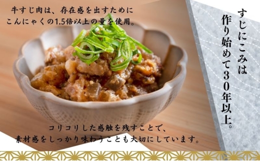 福寿の牛すじ煮込みは、作り始めて30年以上。ふるさと納税をはじめるために特別に調達したA5ランク国産和牛のすじ肉を、丁寧な仕込みと独自の製法でじっくり煮込み、旨みを余すことなく引き出しました。玉ねぎの水分だけで煮込むことで、自然な甘みと深いコクを実現。さらに群馬県産こんにゃくや南あわじ産玉ねぎなど、こだわりの国産素材を合わせています。
