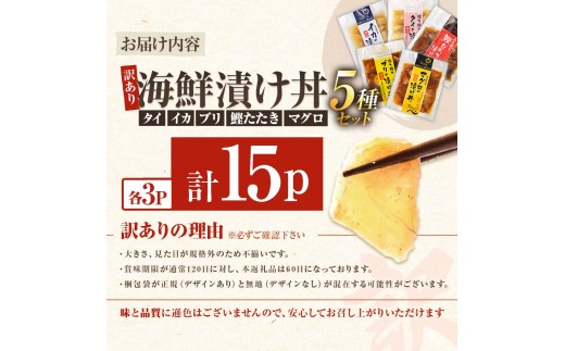 - 訳あり 海鮮漬け丼 (5種×各3P) セット マグロ 鯛 イカ ブリ 鰹のたたき 漬け丼 海鮮丼 漬け づけ丼 国産 食べくらべ 漬け丼の素 海鮮丼の具 海鮮セット まぐろ いか ぶり 鯛 かつおのたたき 鰹タタキ 訳アリ 不揃い 規格外 わけあり 食べ比べ 海鮮 魚介類 水産加工品 冷凍 食品 保存食 鯛茶漬け 小分け 一人暮らし 簡単 高知 惣菜 16000円